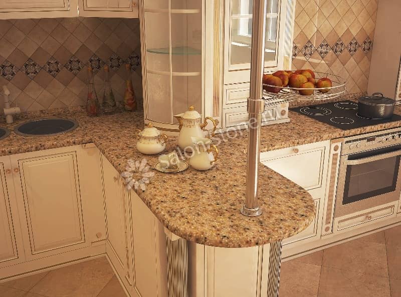При производстве нами был использован светло-ореховый оттенок с большим количеством вкраплений различных цветов. Такая столешница не только идеально вписалась в интерьер, но и создала своеобразную
